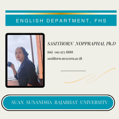 ผศ.ดร.ศศิทร นพประไพ สำเร็จการศึกษาระดับปริญญาเอก อักษรศาสตรดุษฎีบัณฑิต (ภาษาศาสตร์) จากคณะอักษรศาสตร์ จุฬาลงกรณ์มหาวิทยาลัย ปัจจุบันดำรงตำแหน่งหัวหน้าสาขาวิชาภาษาอังกฤษ มหาวิทยาลัยราชภัฏสวนสุนันทา มุ่งพัฒนาการเรียนการสอนด้านภาษาและภาษาศาสตร์เพื่อเชื่อมโยงความรู้กับการใช้จริงและการเรียนรู้ตลอดชีวิต.